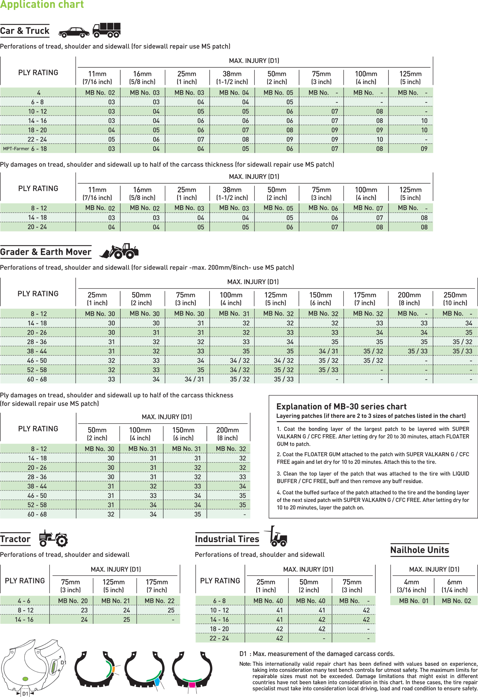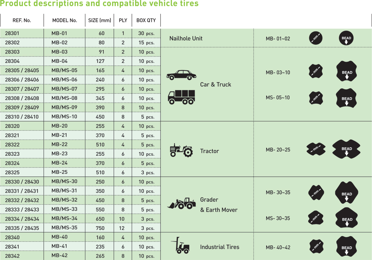 Maruni MB/MS patches are designed for inner repair of bias tires.They can be used on a wide range of tires, from passenger cars to trucks and heavy equipment.A broad size range allows proper repair according to the size and location of the injury.