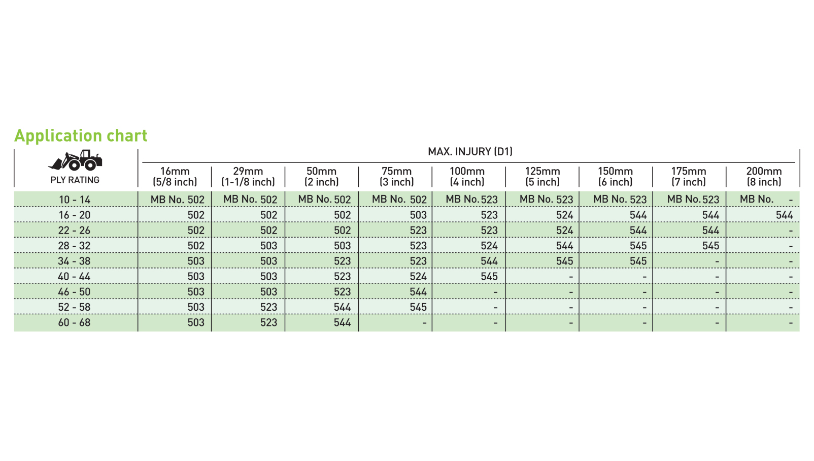 The MB-500 Series is specially designed for OTR (Off-The-Road) bias tires.It is recommended for repairs on heavy-duty tires used in construction, mining, and industrial applications.These patches are engineered to withstand extreme load, heat, and flexing conditions typical of OTR operations.
