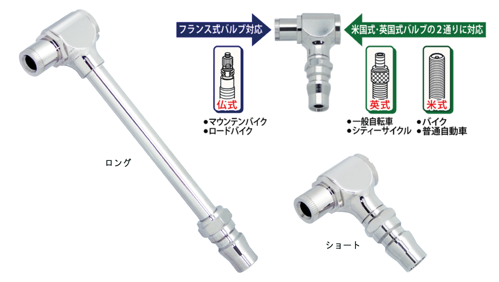 仏式、英式、米式の3パターンのバルブに対応したエアーチャックです。バルブに合わせたエアーチャック交換の必要がないので作業効率が向上します。